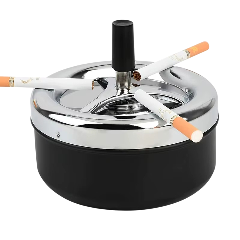 Cinzeiro rotativo moderno de aço inoxidável com mecanismo auto-limpante e tampa. Acessório elegante, prático e durável para fumadores. Descrição completa