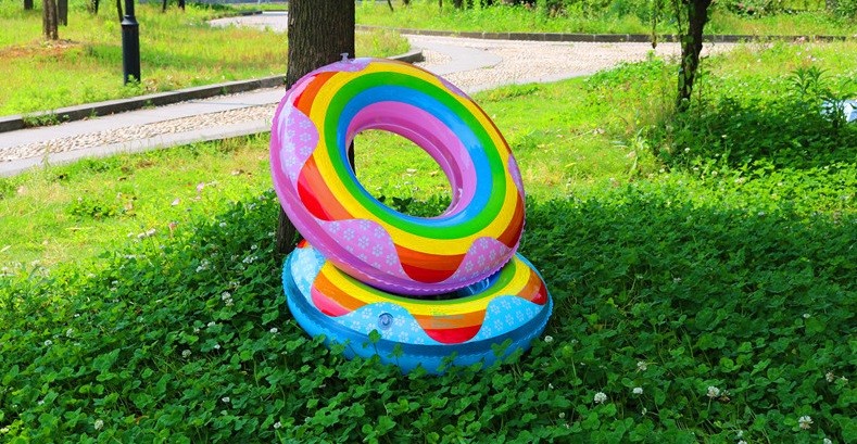 Círculo de natação insuflável em cores arco-íris, rosa para meninas e azul para meninos.