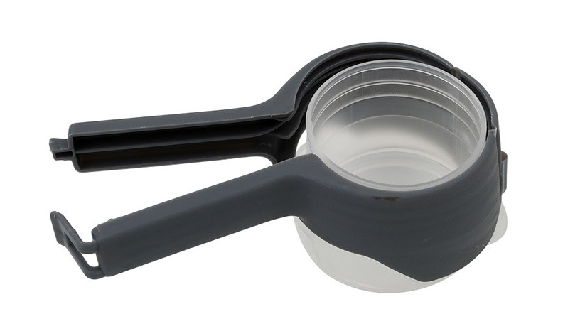 Clipe de vedação para sacos com tampa para fácil despejo do conteúdo.