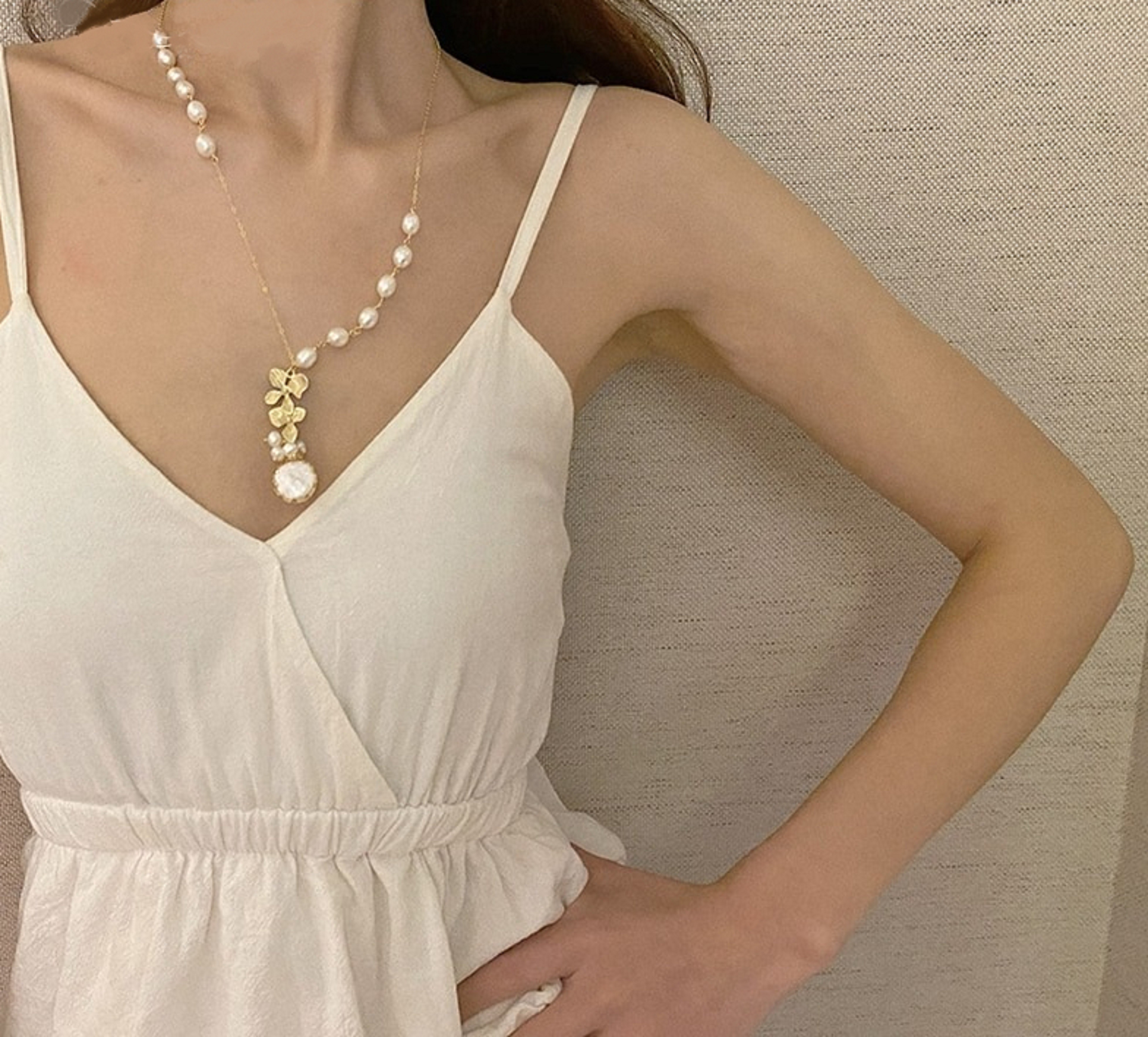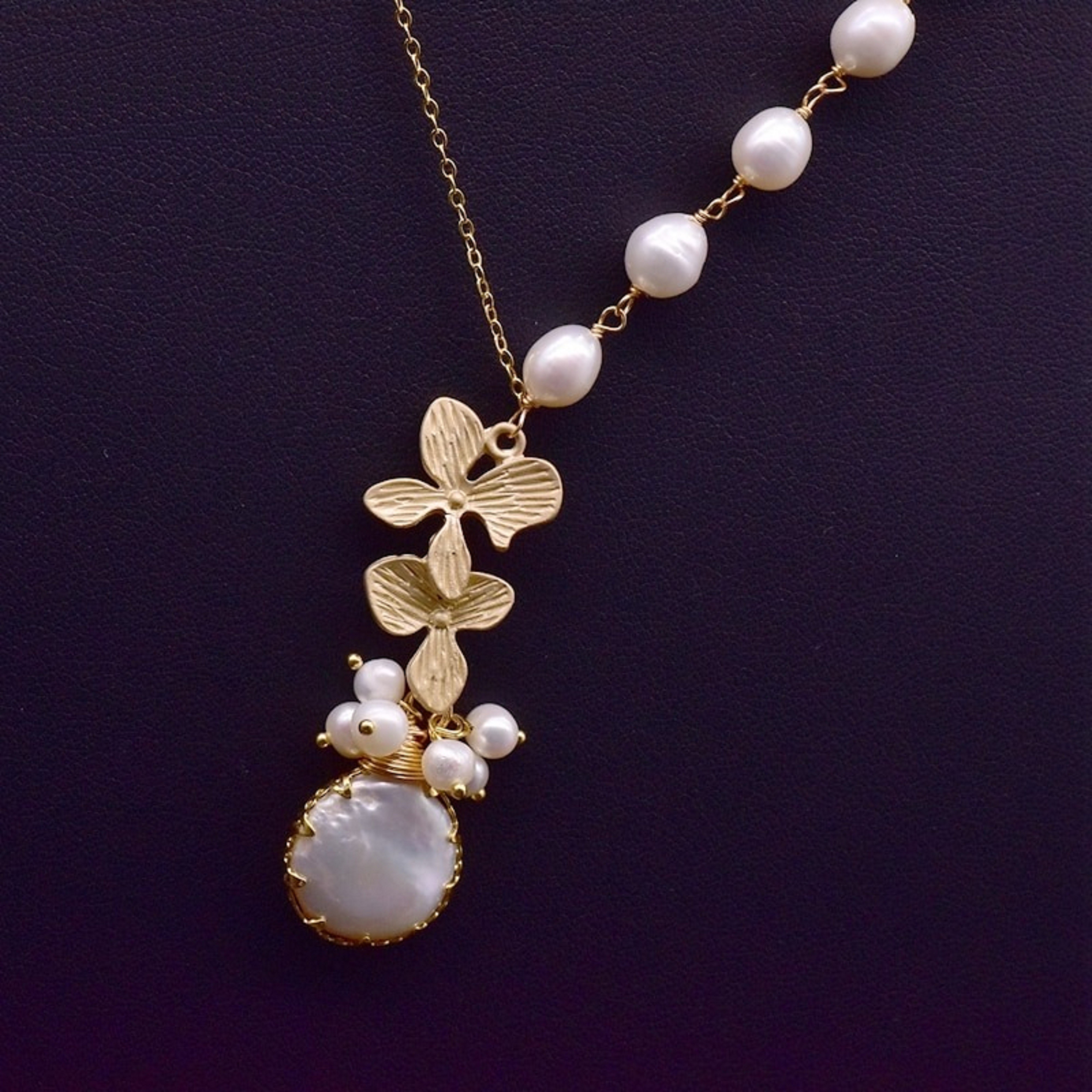 Colar feminino com pérolas e flores