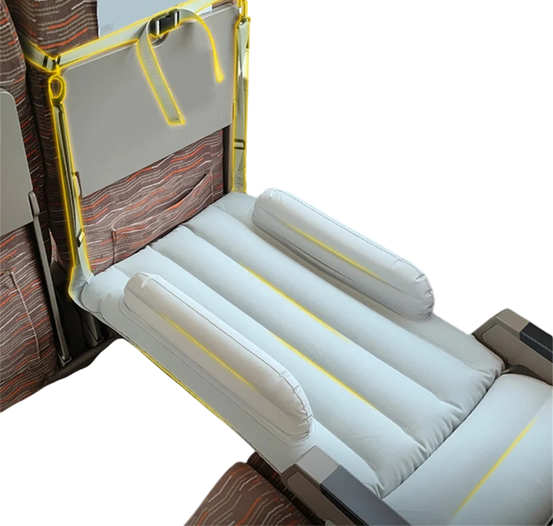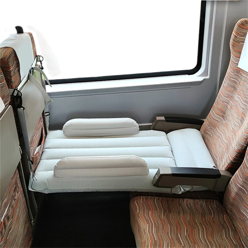 Prático colchão insuflável para crianças em PVC com design ergonómico e cintas ajustáveis, ideal para carro, avião e comboio. Descrição completa