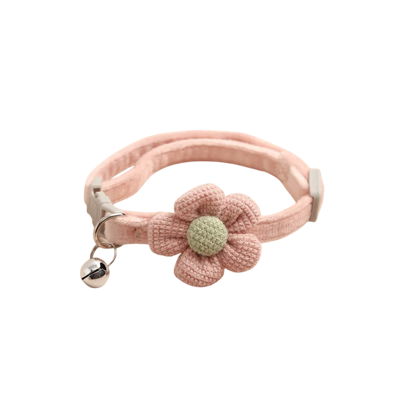 Coleira têxtil estilosa com flor e sininho para gatos e cães pequenos. Comprimento ajustável, adequada para o outono e inverno. Descrição completa