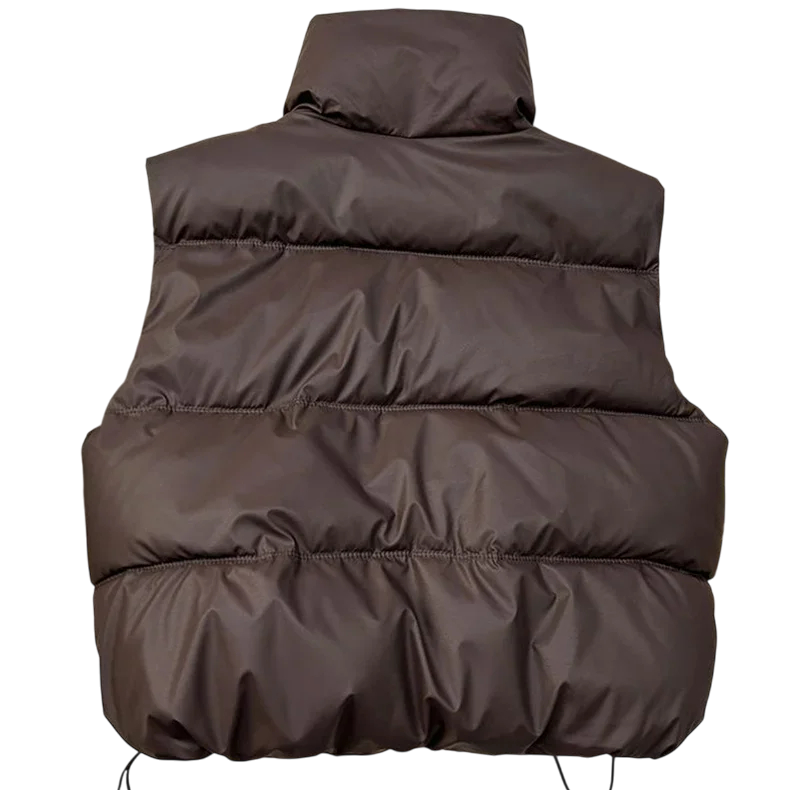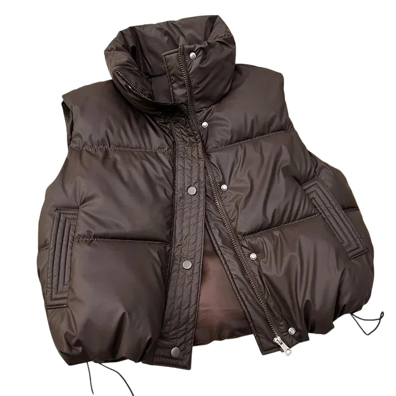Colete de inverno feminino elegante com gola alta e fecho de zip, complementado com bolsos práticos. Material quente e confortável de algodão e poliéster para o período de inverno. Descrição completa