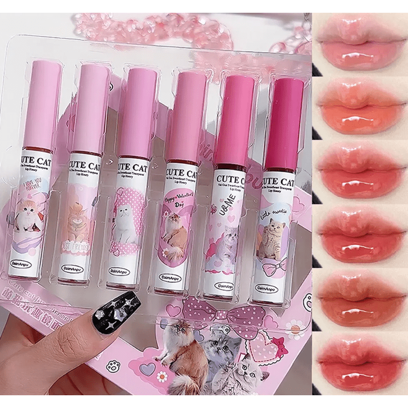 Conjunto 6x 2g brilho labial Hidratante Lip Gloss com estampado de gato Brilhos labiais Mini embalagem Cosméticos Conjunto de presente para mulheres e raparigas