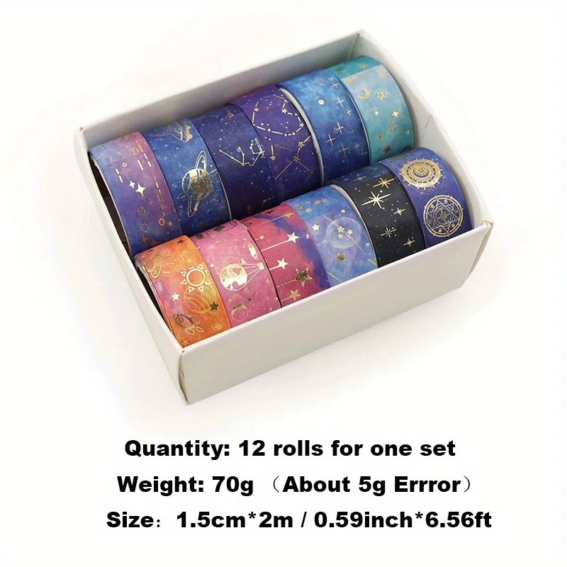 Conjunto de 12 rolos de fita adesiva 1,5 cm x 2 m Céu Noturno Polar estrelas douradas lua planetas constelações conjunto premium para artesanato