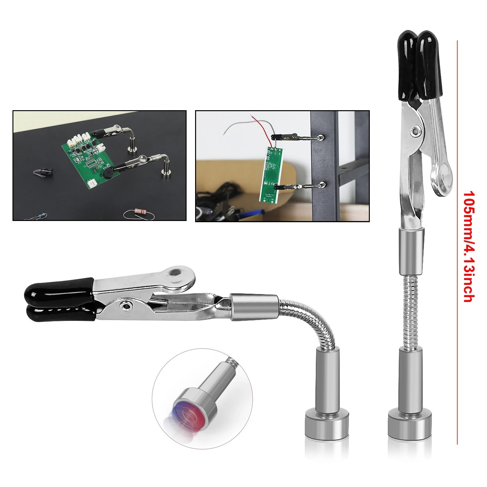 Conjunto de 2 braços flexíveis magnéticos com garras de crocodilo Suportes para PCB e trabalhos eléctricos Comprimento 105 mm Bases magnéticas fortes