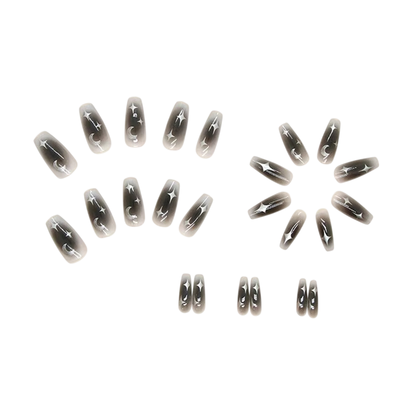 Este conjunto é a escolha ideal para quem deseja sair do clássico e adicionar um leve elemento decorativo ao seu visual com um toque pessoal. Os motivos inspirados no céu noturno apresentam-se de forma elegante e ao mesmo tempo lúdica. As unhas são confortáveis de usar, mantêm a sua forma e são adequadas para vários estilos de vestuário. Representam uma solução prática para uma rápida e eficaz embelezamento das mãos sem a necessidade de uma manicure exigente.