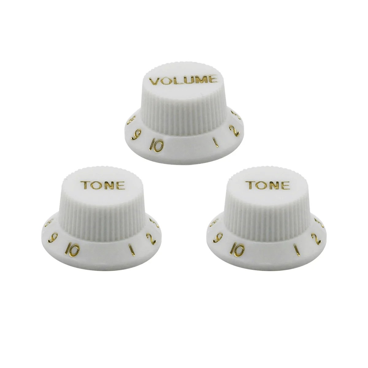 Conjunto de substituição de três botões de plástico para controlar o tom e o volume em guitarras elétricas ST. Compatível, fácil de instalar. Descrição completa