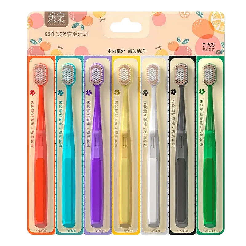 Conjunto de 7 escovas manuais de qualidade com cerdas macias e cabeça removível, ideal para uma limpeza confortável dos dentes em casa. Descrição completa