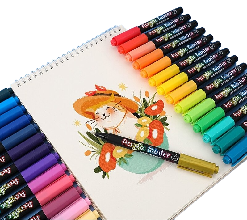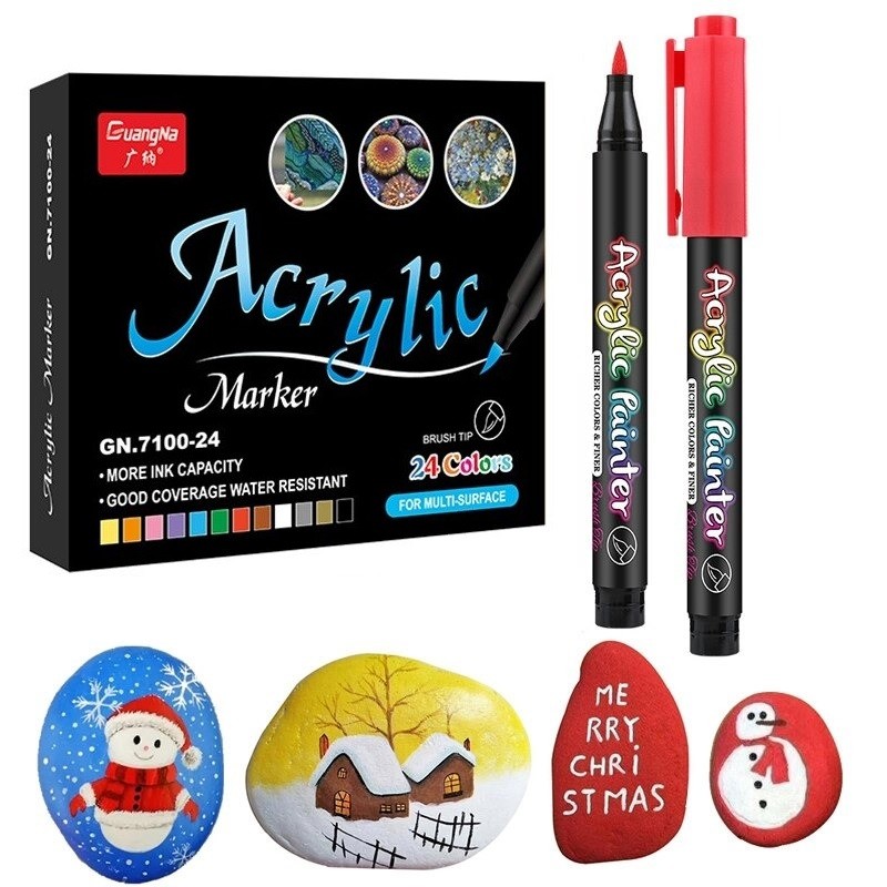 24 marcadores de acrílico e 4 pedras de várias formas. Adequado para crianças e adultos. Tinta à prova de água e não tóxica. Descrição completa