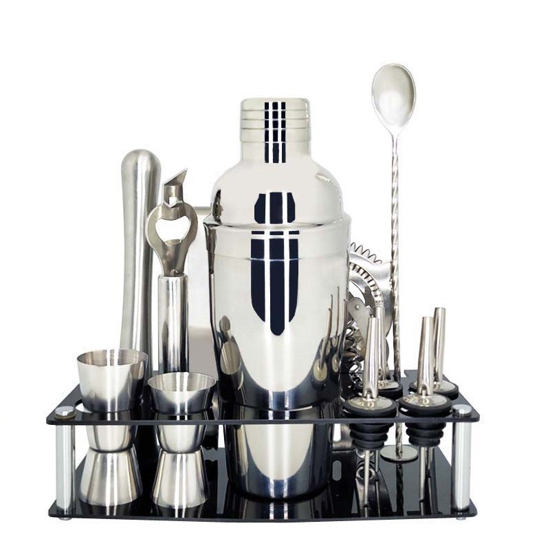 O conjunto inclui: shaker, pinças para gelo, colher de mistura, macerador, saca-rolhas, abridor de latas e garrafas, quatro funis, duas medidas de shot e um coador de bar.