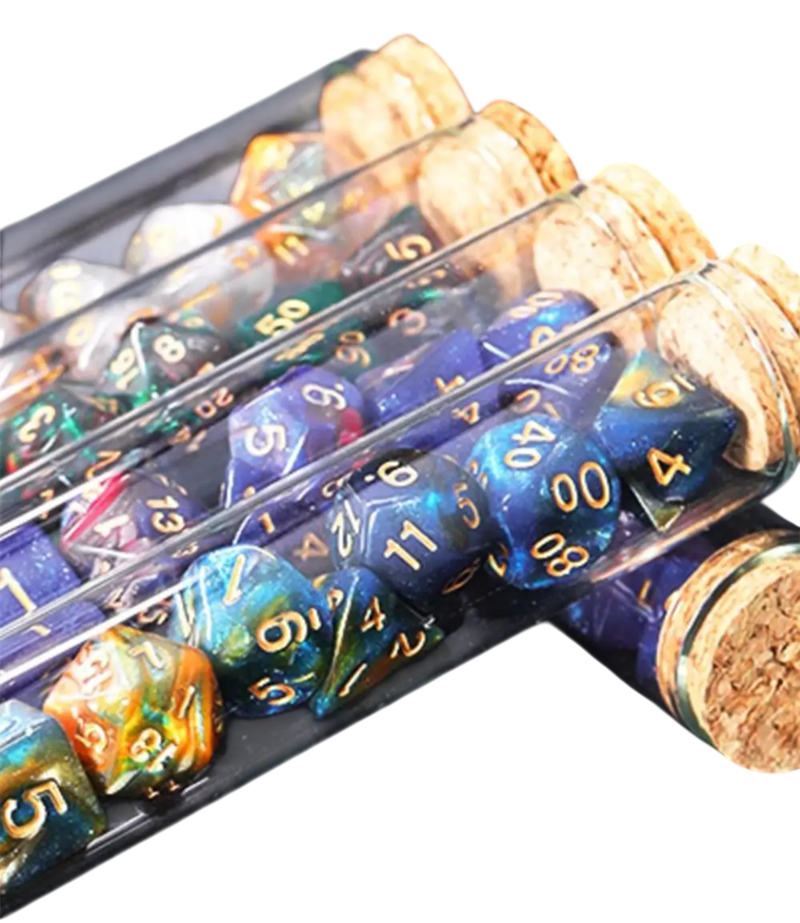 Dados poliedricos armazenados em frasco de poções combinam um visual de fantasia com funcionalidade e são ideais para jogos de tabuleiro RPG. Descrição completa