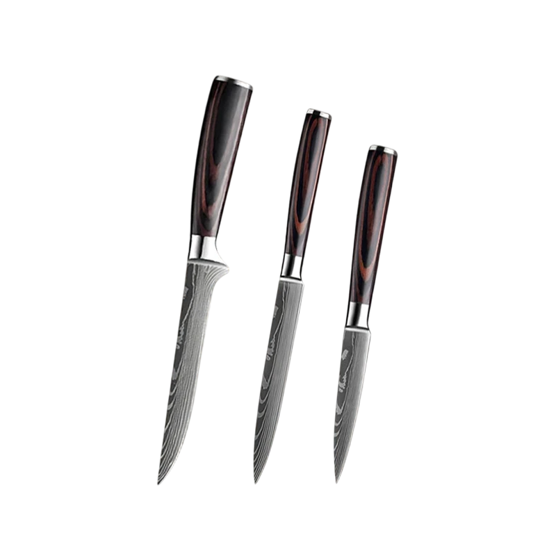 Conjunto de facas de cozinha de 3 peças em aço inoxidável com padrão de damasco a laser. Inclui uma faca Santoku, uma faca de corte universal e uma faca de desossa. Descrição completa