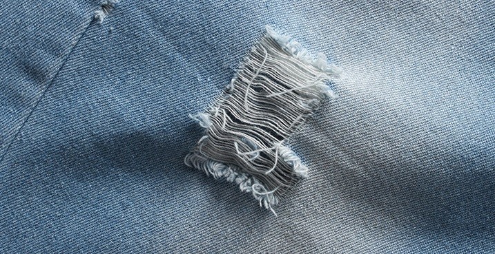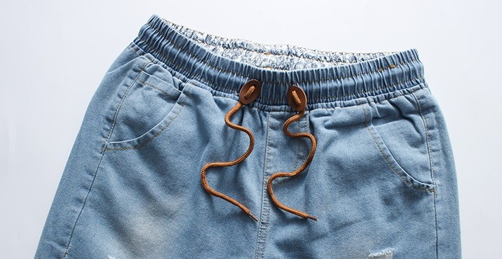 O conjunto inclui uma t-shirt com salpicos de cores e calções de ganga azuis escuros