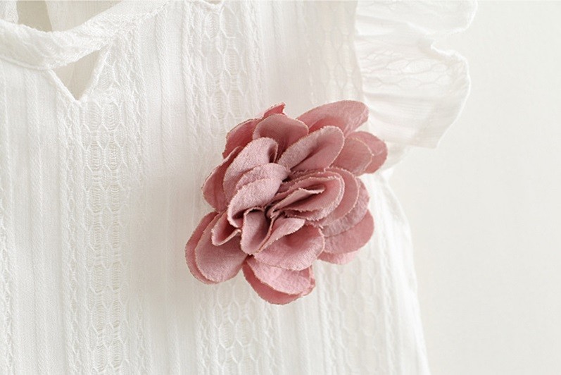 A t-shirt tem uma pequena rosa no canto superior esquerdo e os calções têm bolsos.