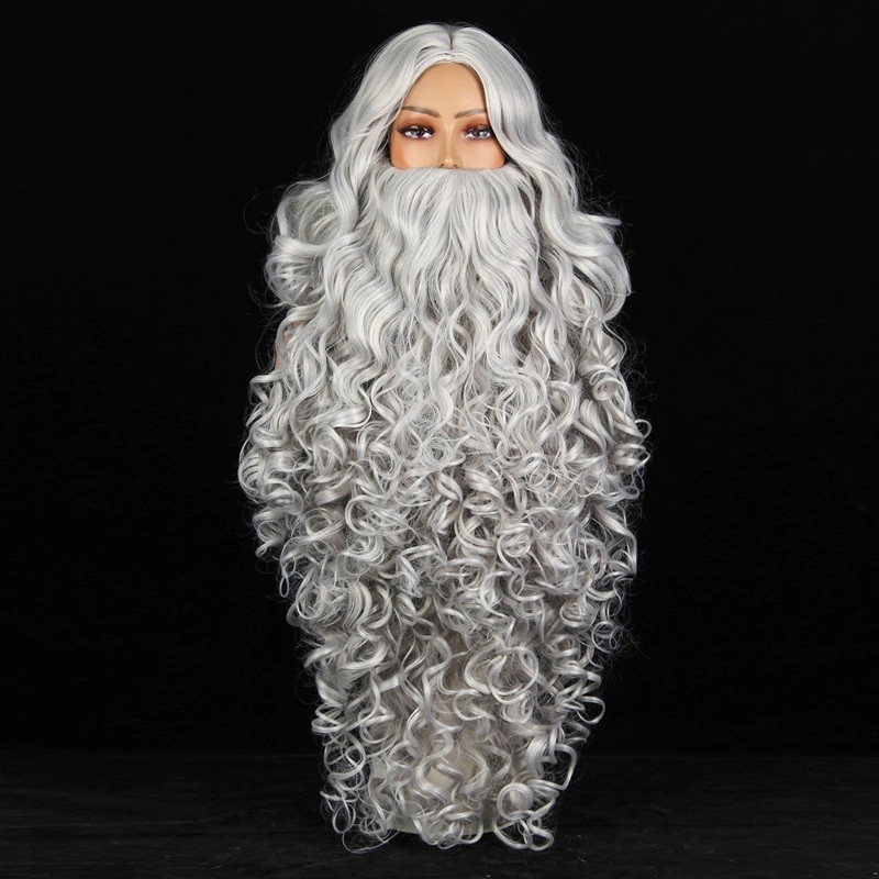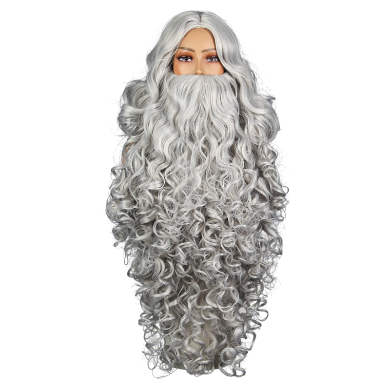 Conjunto de peruca e barba Branca ou cinza Peruca longa e ondulada com barba espessa Fantasia Cosplay Carnaval Acessório de teatro