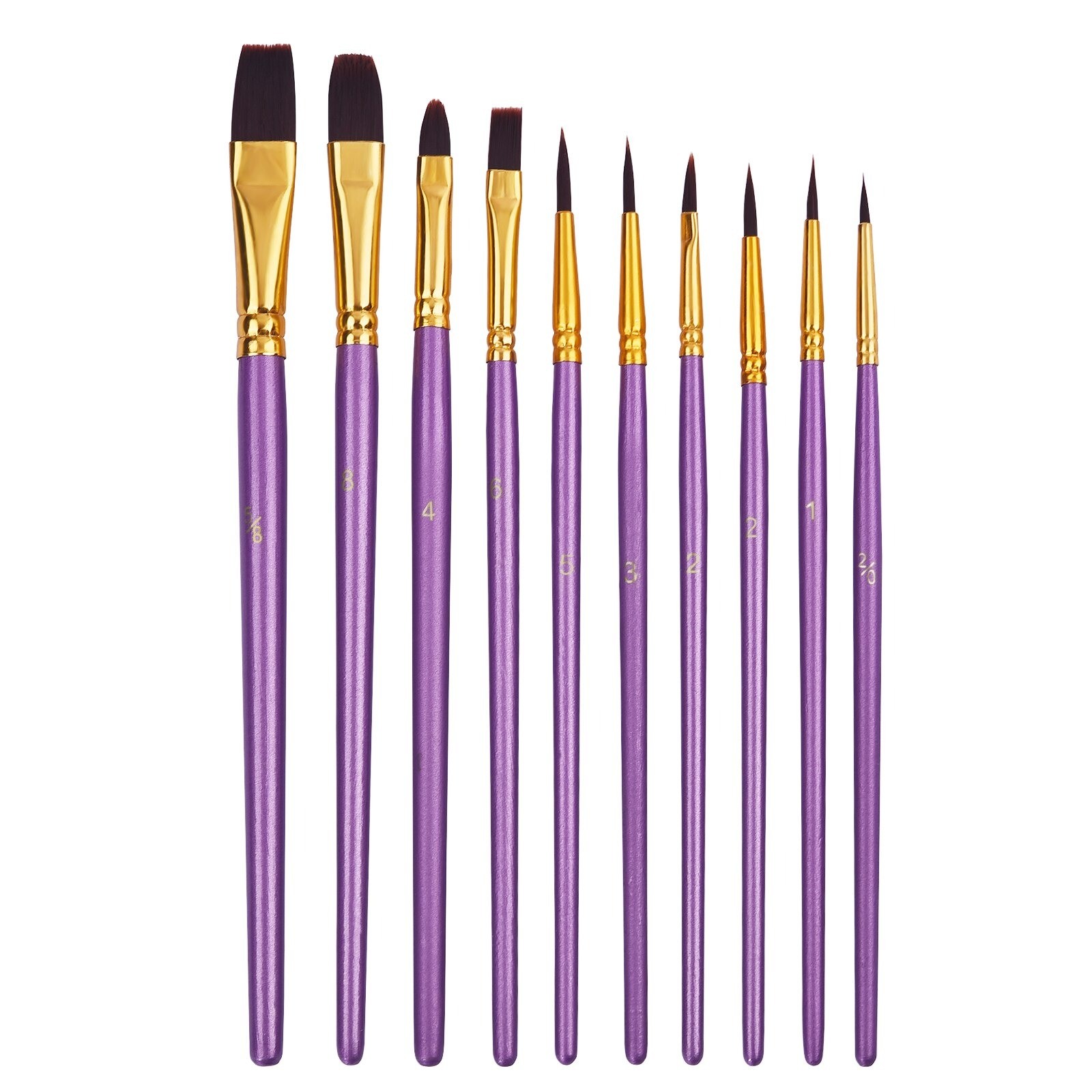 10 pcs de diferentes tamanhos. Cerdas suaves. Adequados para tintas acrílicas e óleos. Descrição completa