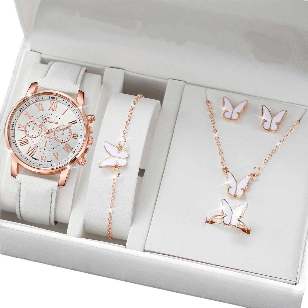 Conjunto de relógio e joias femininas Colar elegante pulseira brincos anel com borboleta Presente de luxo para mulheres Caixa de presente