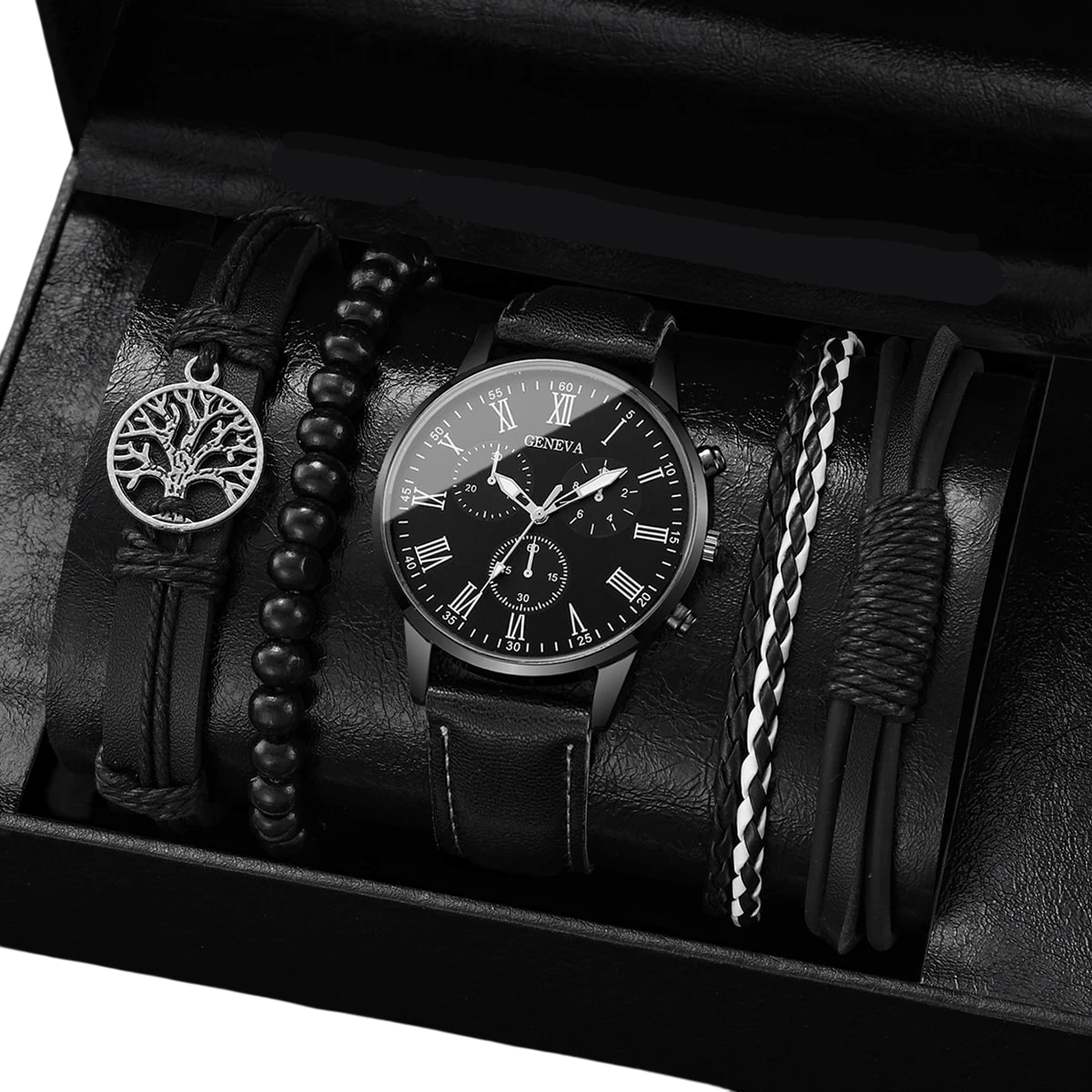 Este elegante conjunto de relógios masculinos com bracelete de couro, três braceletes de couro e um bracelete de contas representa a combinação ideal de um acessório prático e joias estilizadas. Relógios com mostrador preto e bracelete de couro têm um aspeto minimalista e ao mesmo tempo elegante. Graças a isso, são perfeitos para uso diário e para ocasiões festivas.