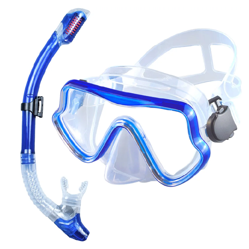 Equipamento de qualidade para snorkel com óculos de vidro temperado e vedação em silicone, complementado por um snorkel confortável com válvula de ar. Descrição completa