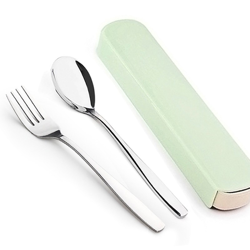 O conjunto contém uma colher de aço inoxidável com um garfo e um estojo.
