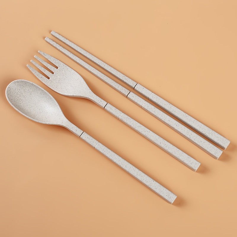 O conjunto inclui um garfo, uma colher e pauzinhos com estojo.