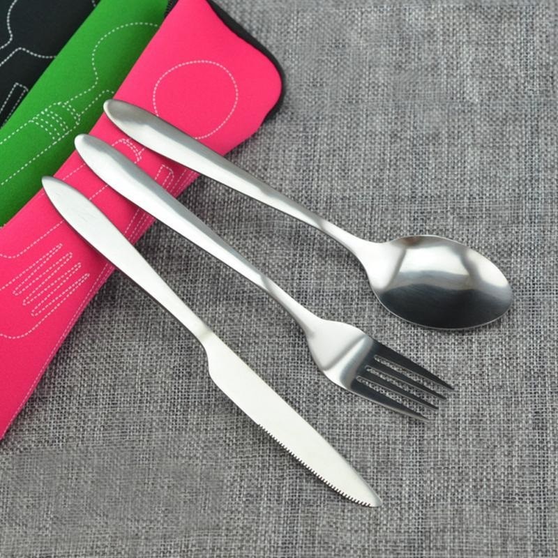 O conjunto de talheres em aço inoxidável de três peças inclui um garfo, uma faca e uma colher. Os talheres estão armazenados num estojo colorido com fecho éclair.