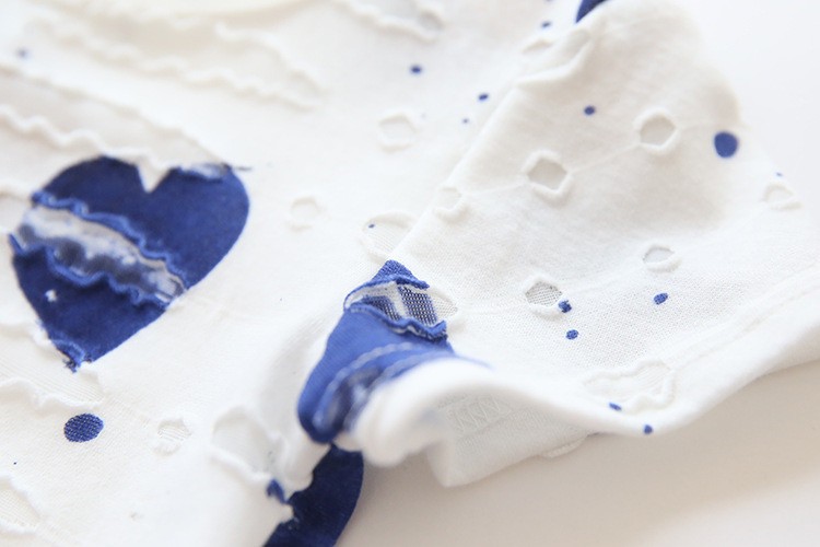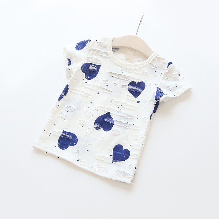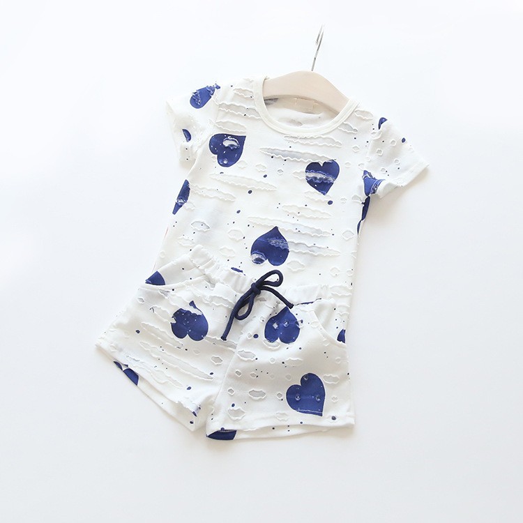 Conjunto de verão infantil com padrão de corações, que contém top e calções.