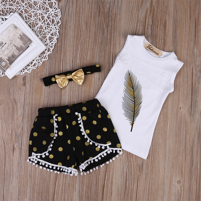 O conjunto é composto por uma t-shirt branca com penas e calções pretos com bolinhas, e inclui ainda uma faixa com laço.