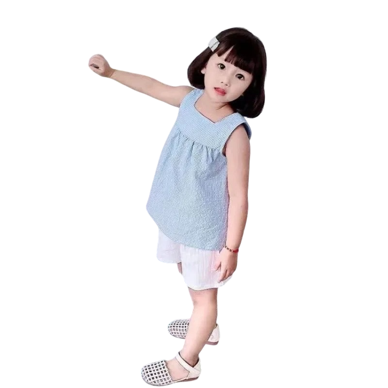Conjunto de Verão para Meninas T-shirt Azul com Alças Largas e Calções Brancos com Pregas Decote Redondo com Botão