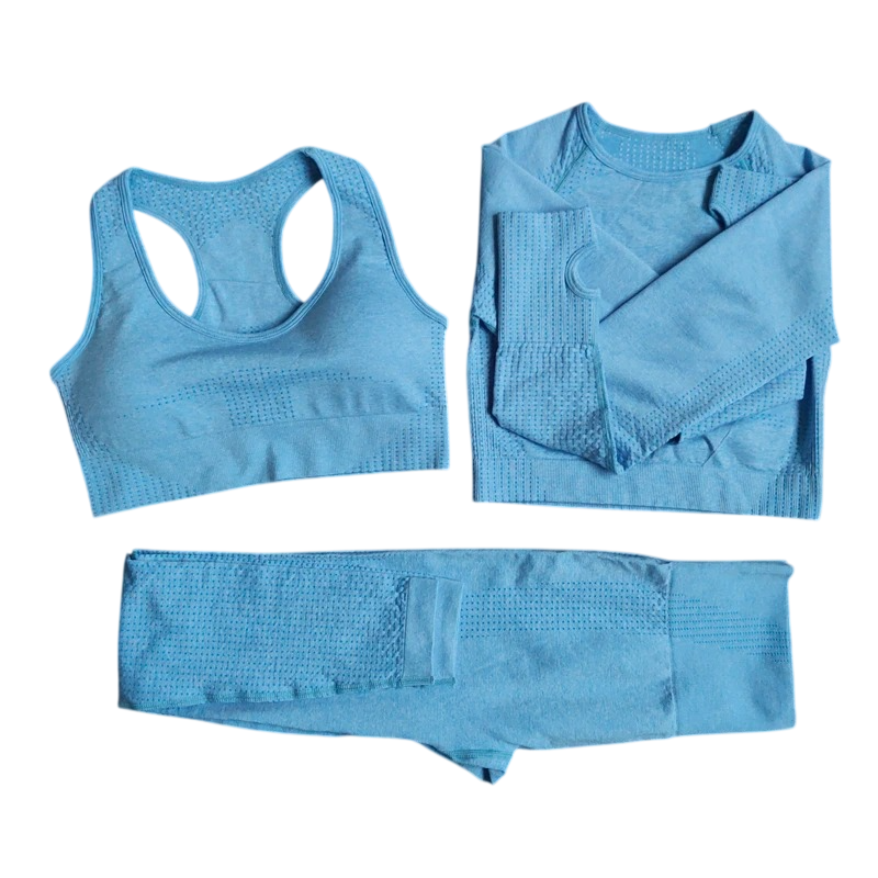 Conjunto desportivo feminino com soutien desportivo, t-shirt de manga longa e leggings Conjunto de fitness de uma só cor