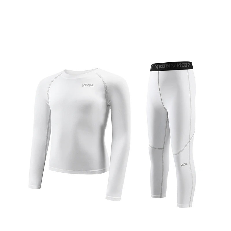 Conjunto desportivo para rapazes com camisola de compressão e leggings que apoia o desempenho, conforto e liberdade de movimento durante o treino e a brincadeira. Descrição completa
