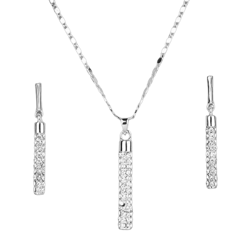 Envolva-se em luxo com este conjunto feminino de colar e brincos com diamantes artificiais. Revele a sua irresistível elegância e brilho com o nosso conjunto feminino que inclui um colar e brincos adornados com diamantes artificiais. Este deslumbrante conjunto é destinado a todas as mulheres que desejam uma joia que lhes confere charme e nobreza independentemente da ocasião.