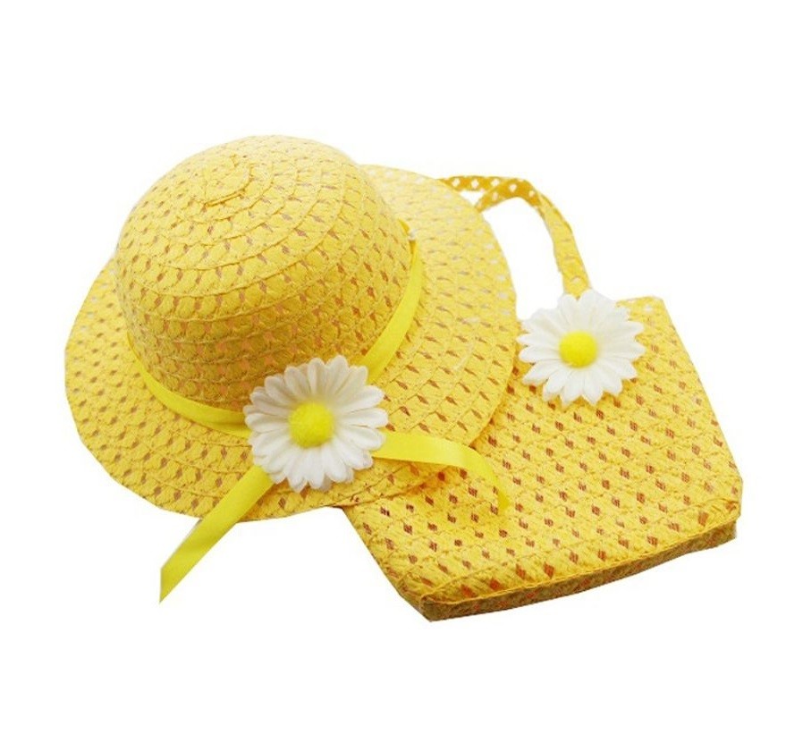 Krásný dívčí letní set - slaměný klobouk a kabelka ve stejné barvě.