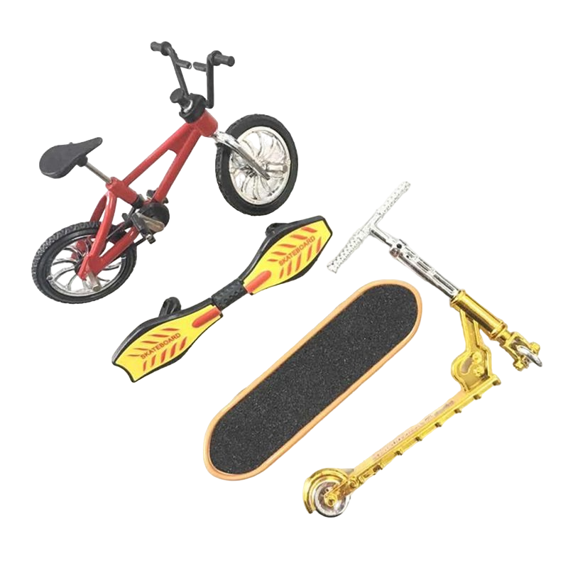 Conteúdo da embalagem: 2x mini skateboard, 1x mini bicicleta, 1x mini patinete