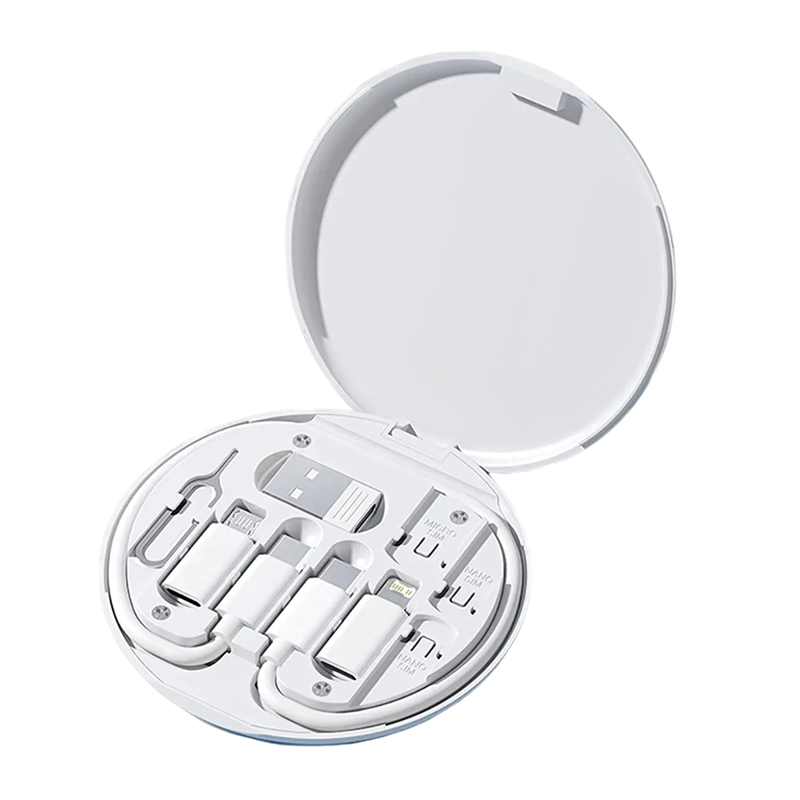 Este conjunto multifuncional de cabo de dados com suporte a carregamento rápido PD 60W é uma solução prática para quem viaja frequentemente ou trabalha com diferentes tipos de dispositivos. A caixa de armazenamento compacta esconde tudo o que é necessário – cabo USB tipo C, adaptadores para Micro USB, Lightning e Tipo-C, agulha para remoção do cartão SIM e espaço para armazenamento de cartões de memória. Com suporte a potência de carregamento de até 60 W e corrente de 3 A, consegue carregar os seus dispositivos de forma rápida e eficiente. Devido ao seu tamanho e arranjo interno bem pensado, a caixa cabe facilmente em qualquer mala ou mochila. Disponível em variantes branca e preta, para que possa escolher o estilo que mais lhe convém.