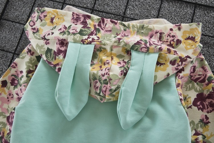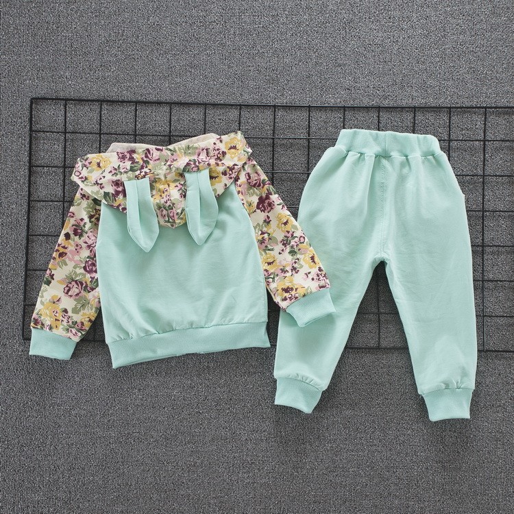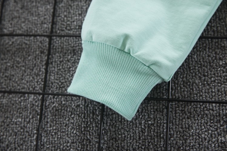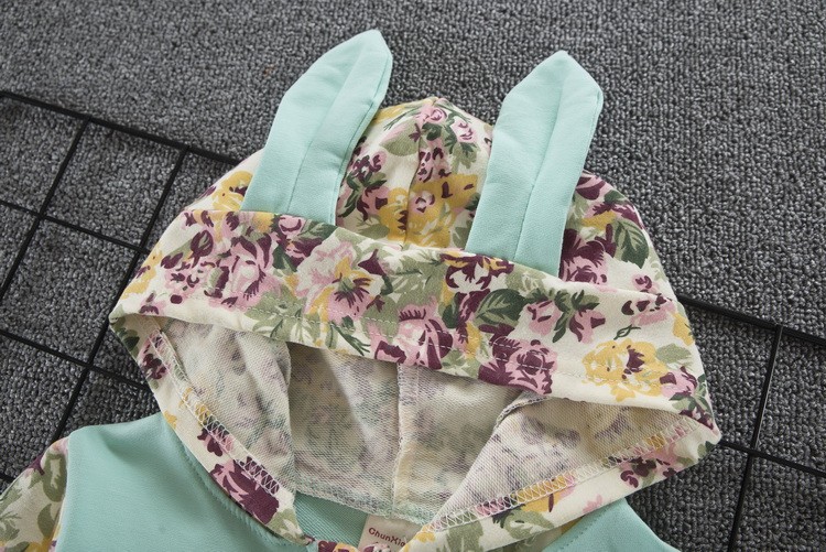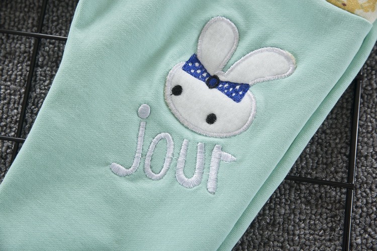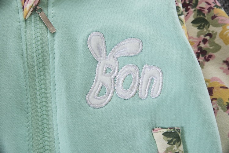 O conjunto é composto por uma sweatshirt com capuz e calças, nas quais está um coelhinho.
