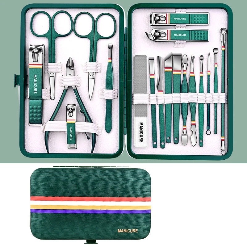 O conjunto profissional de manicure em aço inoxidável, contendo 19 ferramentas para cuidados com os pés, unhas e rosto, é um auxiliar indispensável para quem valoriza cuidados de qualidade e completos para o corpo. Este conjunto, colocado num estojo de couro, é ideal como presente ou para uso pessoal. Cada ferramenta do conjunto é fabricada em aço inoxidável de alta qualidade, o que garante longa durabilidade e resistência à corrosão.