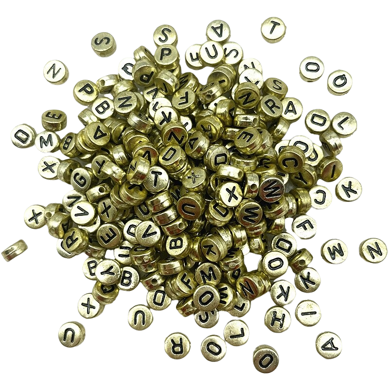 Contas com letras. Dimensões: 4 x 7 mm. Cores variadas. Descrição completa