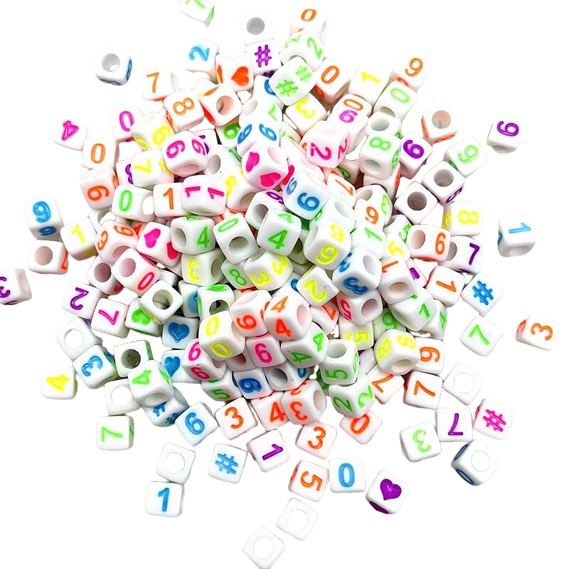Contas com impressão de números. Dimensões: 6 x 6 x 6 mm. Cores variadas. Descrição completa
