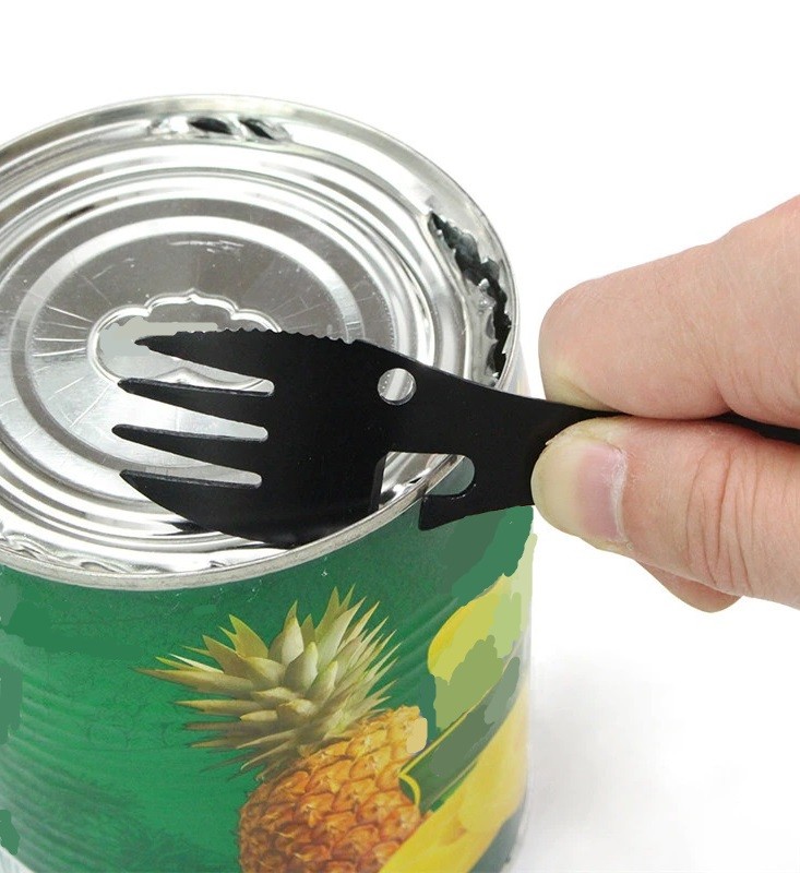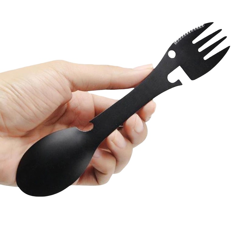 Este utensílio multifuncional é ideal para acampamentos e caminhadas. Pode ser utilizado como colher, garfo, faca, abridor de garrafas ou de latas. É fabricado em aço inoxidável.