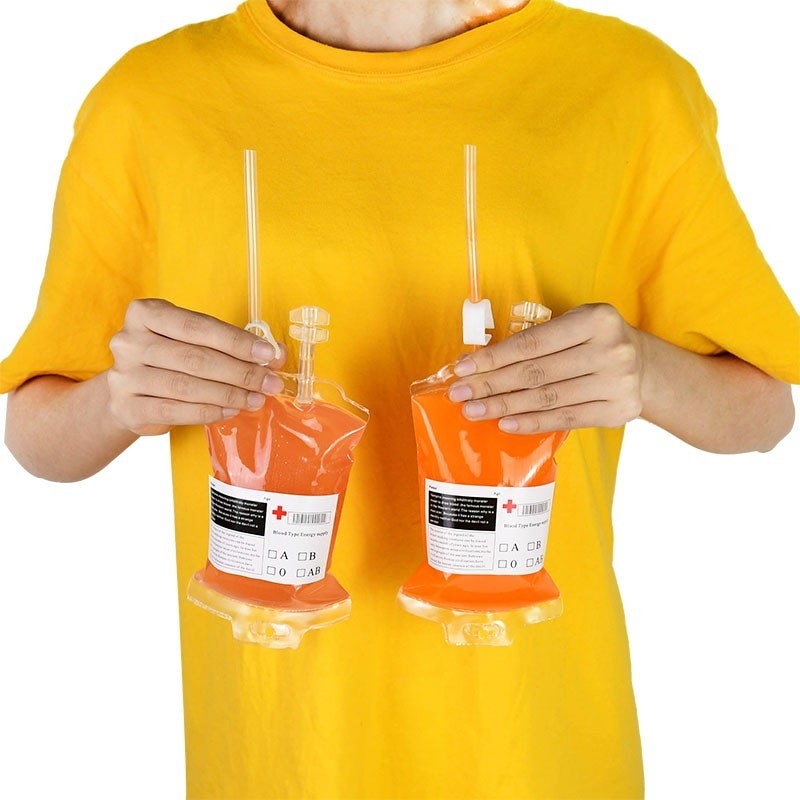 Adequados para festas de Halloween. Sacos de bebida com padrão dos tipos de sangue A, B, AB, 0. Capacidade do saco 400 ml. Descrição completa