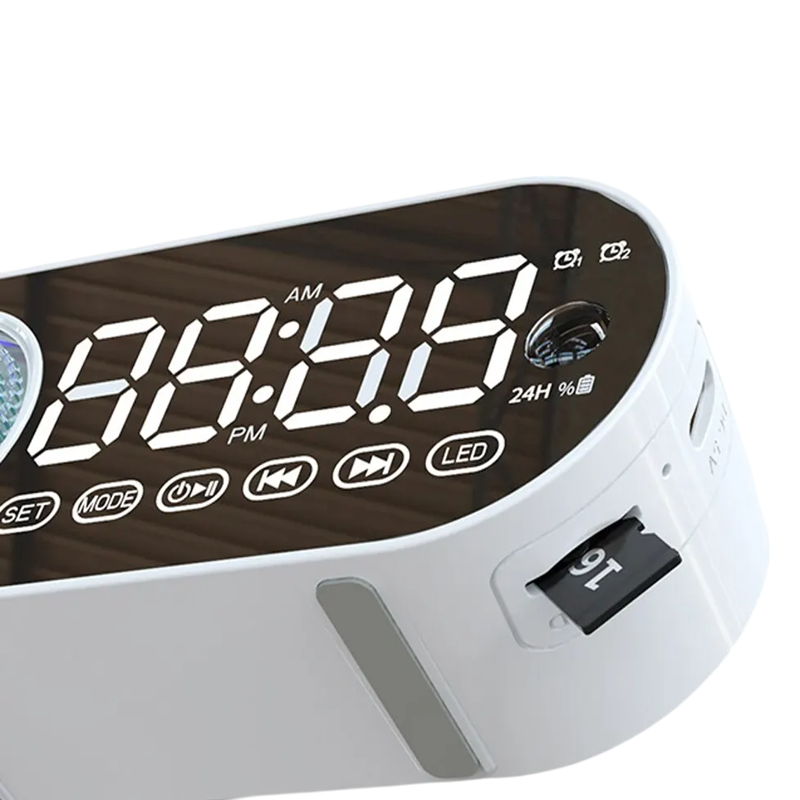 Este despertador inteligente é mais do que apenas um cronómetro – combina funções práticas, experiência musical e efeito decorativo num único dispositivo. Graças ao ecrã LED espelhado, é bem legível de dia e de noite. Ligação sem fios, som de qualidade e possibilidade de reprodução a partir de várias fontes tornam-no um assistente versátil. Iluminação RGB e design compacto fazem dele um complemento ideal para um interior moderno. Despertador com reprodutor Bluetooth é uma excelente escolha para quem deseja estilo e funcionalidade num só.