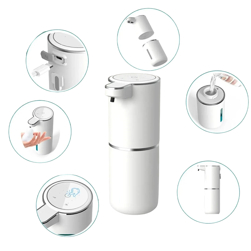 Dispensador sem contacto USB com sensor infravermelho e quatro modos de dosagem, adequado para sabão espumoso, champô e detergente para a louça. Descrição completa