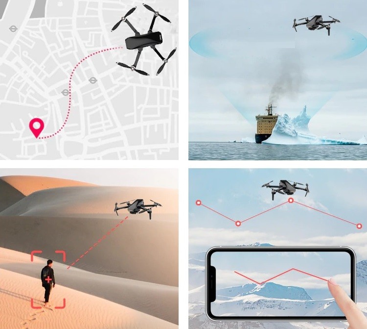 Funções inteligentes e equipamento: gimbal de três eixos, GPS, nível 7 de resistência ao vento, 5G, zoom 50x, retorno automático com um botão, voo de ponto de trajetória, rotação 360°, seguimento de objetos, arranque automático, aterragem automática, modo RTH