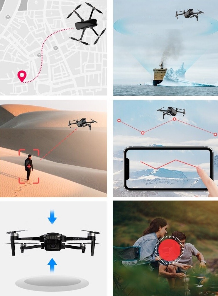Funções inteligentes e equipamento: gimbal de três eixos, GPS, seguimento de objetos, manutenção automática de altitude, transmissão de imagem ao vivo, retorno automático com um botão, rotação 360°, voo de ponto de trajetória, arranque automático, aterragem automática