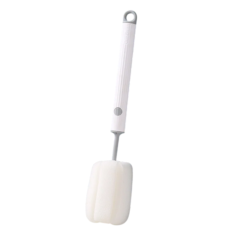 Escova prática com esponja macia e cabo longo que facilita a limpeza de copos, frascos, termoss e garrafas de bebé sem danificar a superfície. Descrição completa