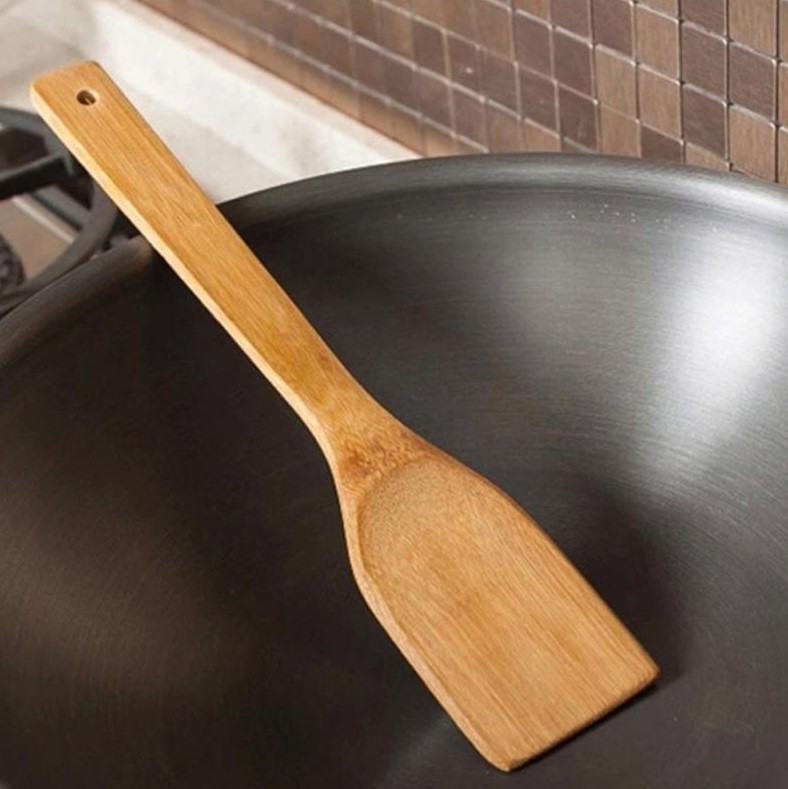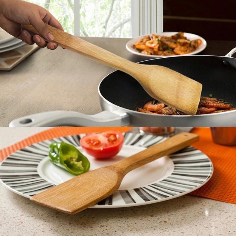 A espátula de bambu natural ajuda-o em cada tarefa na cozinha.