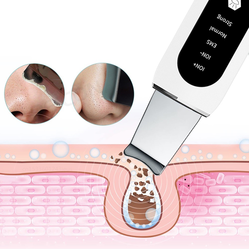 A espátula ultrassónica para o rosto proporciona uma pele bonita e saudável. Garante uma limpeza profunda da pele e um resultado perfeito. Graças às vibrações, penetra na pele e elimina todas as imperfeições. Está equipada com um ecrã LED, que lhe permite ter uma visão geral das funções.