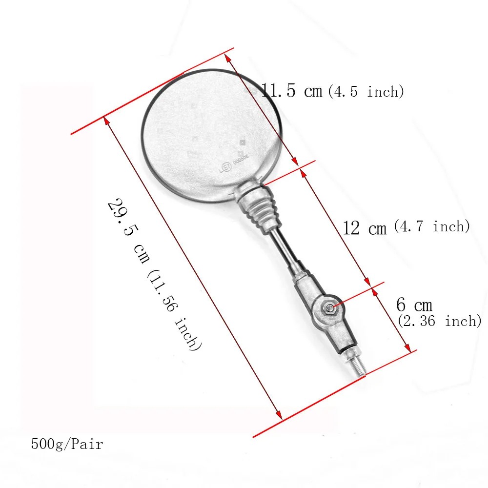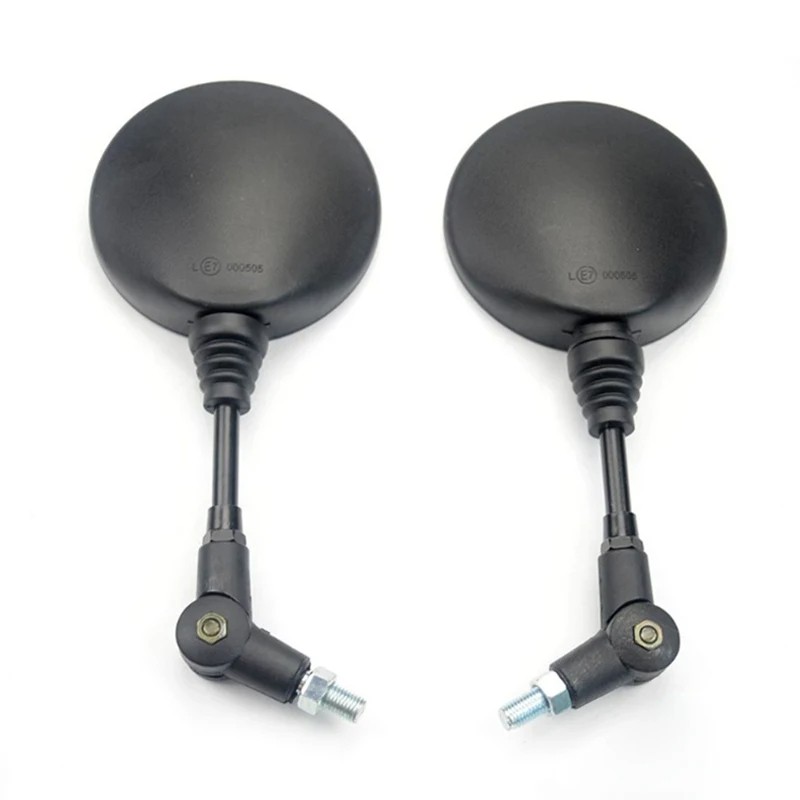 Conjunto de 2 espelhos retrovisores redondos com junta rotativa, braço longo de 29,5 cm e rosca de 10 mm. Adequados para a maioria das motos. Descrição completa